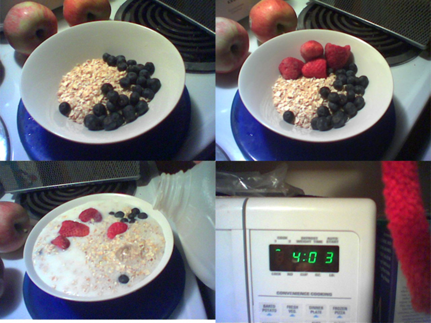 Max made one for me. See pictures. They are very good. The Winter Morning Energy Breakfast is a little complex than if you just mix hot water with oatmeal but since you are putting different fruits in your breakfast, you don’t get bored with the recipe for a while. The recipe is very scientific. It supposes to release energy over a long period of time. (I am not a bio major so don’t quote me on this.) Honey gives you instant energy boost, and then the fruits will start to kick in finally the oatmeal. So you will feel full and energized the instant after you had your breakfast. (Depends on how much honey you put in) and feel full for the entire morning.